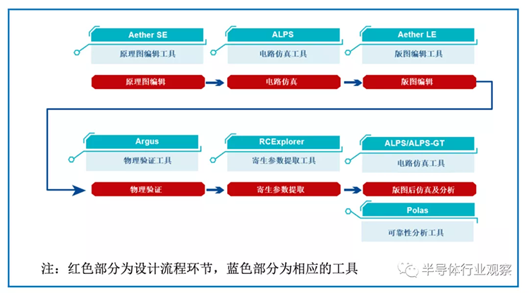 此外,由于压降的存在会直接影响器件的工作性能,而电流密度局部过大会导致金属连线和器件工作失效。因此除了以上的各项验证环节外,压降和电流密度等可靠性分析也是模拟电路设计必不可少的验证环节。上述模拟电路设计全过程的各个环节都需要使用EDA工具。公司是我国唯一能够提供模拟电路设计全流程EDA工具系统的本土EDA企业。该EDA工具系统包括原理图编辑工具、版图编辑工具、电路仿真工具、物理验证工具、寄生参数提取工具和可靠性分析工具等,为用户提供了从电路到版图、从设计到验证的一站式完整解决方案。该模拟电路设计全流程EDA工具系统具体如下图所示: