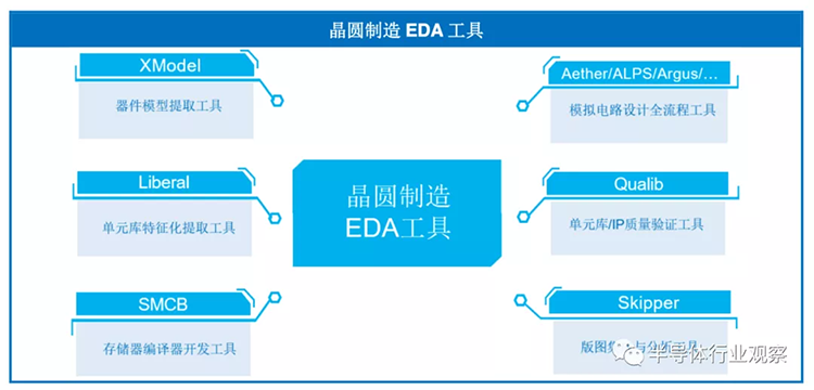 公司针对晶圆制造厂的工艺开发和IP设计需求,提供了相关的晶圆制造EDA工具,包括器件模型提取工具、存储器编译器开发工具、单元库特征化提取工具、单元库/IP质量验证工具、版图集成与分析工具以及模拟电路设计全流程EDA工具等,为晶圆制造厂提供了重要的技术支撑。公司的晶圆制造EDA工具具体如下图所示: